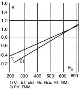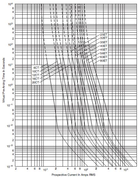 The total clearing I2t at rated voltage and at power factor of 15% are given in the electrical characteristics. For other voltages, the clearing I2t is found by multiplying by correction factor, K, given as a function of applied working voltage, Eg, (rms).
