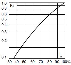 Watts loss at rated current is given in the electrical characteristics. The curve allows the calculation of the power losses at load currents lower than the rated current. The correction factor, Kp, is given as a function of the RMS load current, Ib, in % of the rated current.