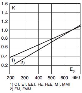 The total clearing I2t at rated voltage and at power factor of 15% are given in the electrical characteristics. For other voltages, the clearing I2t is found by multiplying by correction factor, K, given as a function of applied working voltage, Eg, (rms).