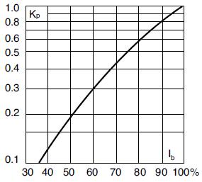 Watts loss at rated current is given in the electrical characteristics. The curve allows the calculation of the power losses at load currents lower than the rated current. The correction factor, Kp, is given as a function of the RMS load current, Ib, in % of the rated current.