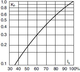 Watts loss at rated current is given in the electrical characteristics. The curve allows the calculation of the power losses at load currents lower than the rated current. The correction factor, Kp, is given as a function of the RMS load current, Ib, in % of the rated current.