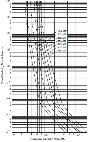 The total clearing I2t at rated voltage and at power factor of 15% are given in the electrical characteristics. For other voltages, the clearing I2t is found by multiplying by correction factor, K, given as a function of applied working voltage, Eg, (rms).