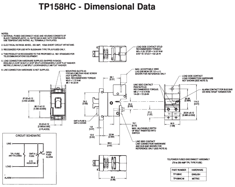 • Application Note: The line connection uses a 1/4-20 bolt (metric – M6X1) that threads into the line terminal. The line terminal is designed with a float of ±.02 in. (± .50mm) to allow for variation in the distance between the TP158HC mounting flange and the line bus bar (see dimensional data). Equipment should be designed to eliminate any relative movement between the TP158HC mounting flange and the line bus bar.